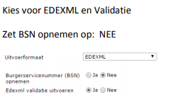 5. Kies in het volgende scherm bij 'Uitvoerformaat' voor EDEXML, BSN opnemen: nee en EDEXML validatie uitvoeren: ja