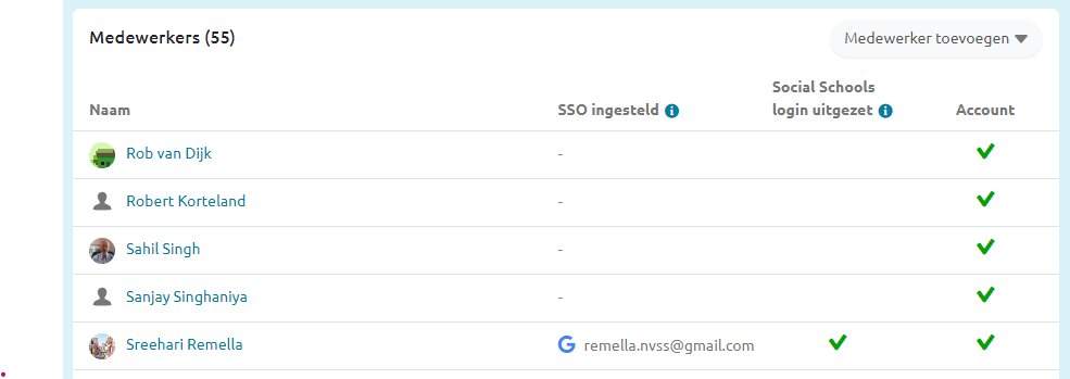 Via Beheer > Gebruikers > Medewerkers kun je zien wie er SSO heeft ingesteld en of het inloggen met de Social Schools gebruikersnaam en wachtwoord in- of of uitgeschakeld is.