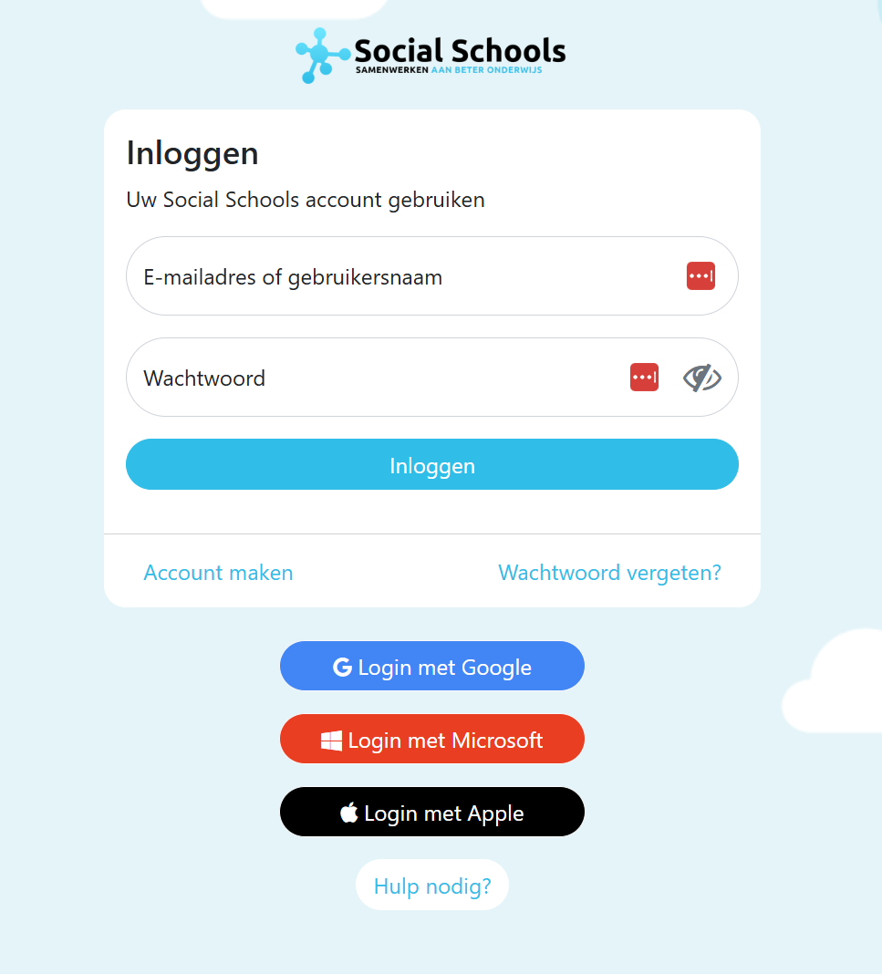 Zodra dit is uitgeschakeld, kunnen medewerkers niet meer met hun Social Schools-gebruikersnaam inloggen en moeten ze voortaan hun Google- of Microsoftaccount gebruiken om in te loggen. Dat kan via de knop "Login met Google of Microsoft".