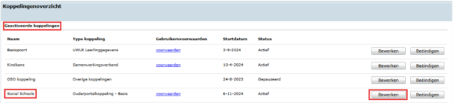 Kies achter de geactiveerde koppeling ‘Social Schools’ voor Bewerken en zet een vinkje bij Absenties.