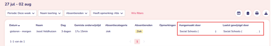 - In de absentiemodule in ESIS zie je bij de kolom “Aangemaakt door” en “Laatst gewijzigd door” Social Schools staan en tussen haakjes zal daar de naam van de melder achter staan.