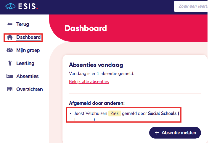 Waar zie ik de absentiemelding in ESIS en kan ik ook zien dat deze in Social Schools is aangemaakt?